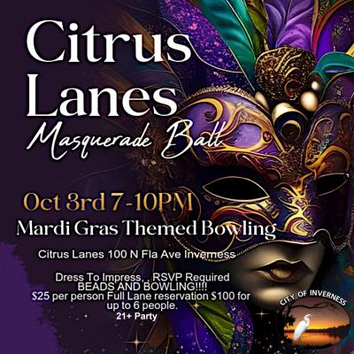 Wear your best Mardi Gras attire and come ready to party!!Citrus Lanes is teaming up with the City of Inverness for a Cootertober event like no other....Beads, drink specials, bowling and MORE!!!$25...