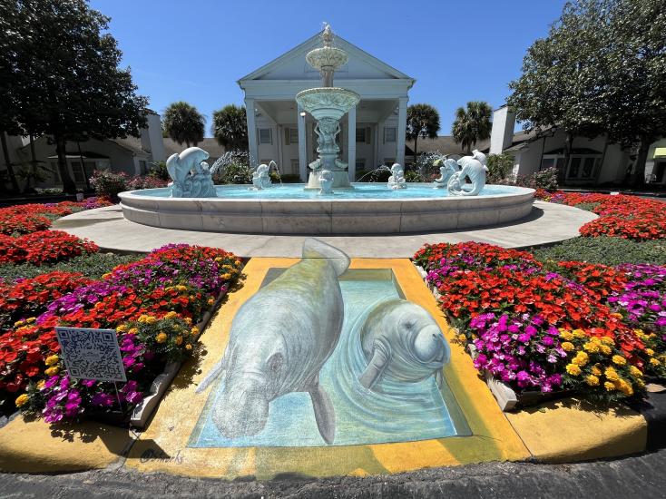 Surrounding a beautiful carved fountain featuring six carved manatees, you will find murals nestled among the flower beds, adding a little extra beauty to the already breathtaking entry to this wonderful resort.