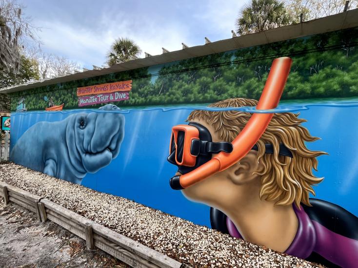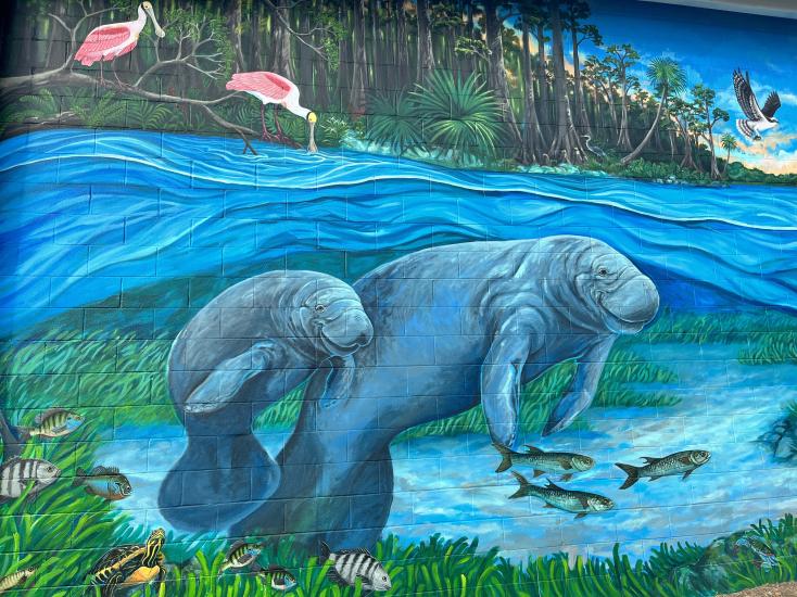 The newest mural in Crystal River was commissioned by the Florida Wildlife Corridor Foundation. It was skillfully created by artist Kelly Quinn from Canvas of the Wild and features species native to the local ecosystem, including Florida black bears, roseate spoonbills, and, of course, manatees. Local trekkers and 12 Lecanto High School art students came out one morning to help Kelly paint the mural in mid-September 2022. According to the Florida Wildlife Corridor Foundation, this unveiling commemorates the first installation of the Corridor Foundation's multi-town mural campaign which brings communities together near at-risk connections to protect their corner of the Florida Wildlife Corridor.