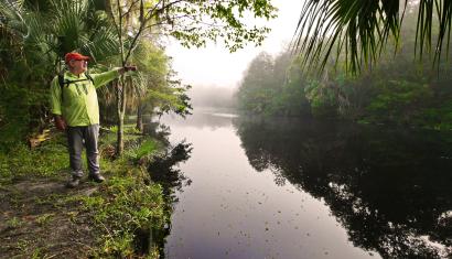 Male and female on individual kayaks, paddling through crystal clear water post-hurricane Milton.