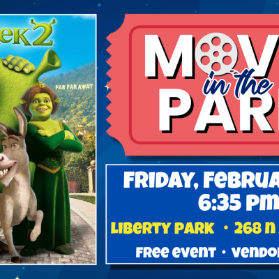 Join us on Friday, February 6th for Movie in the Park at Liberty Park! We’ll be showing Shrek 2 beginning at dusk (approximately 6:35 PM). Bring your blankets, lawn chairs, and picnic baskets for a...