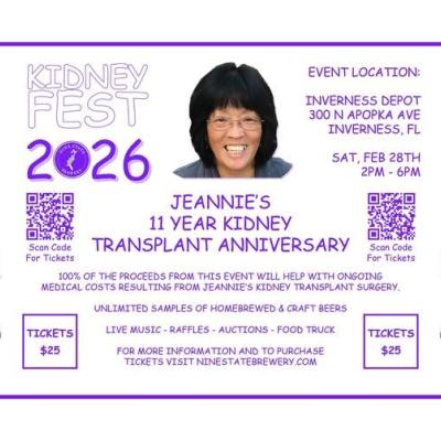 Nine State Brewery in Inverness is hosting it's annual KIDNEY FEST, a local CRAFT BEER FESTIVAL with 100% of the proceeds going toward the ongoing medical costs resulting from Jeannie Lesage's kidney...