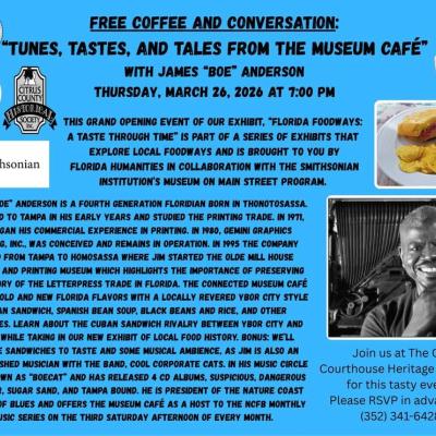 Free Coffee and Conversation: Tunes, Tastes, and Tales from the Museum Café with James “Boe” Anderson.Thursday, March 26, 2026 at 7:00 pm. This Grand Opening Event of our exhibit, “Florida Foodways:...