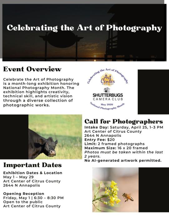 An Opening Reception will take place on Friday, May 1, from 6:30 to 8:30 PM at the Art Center. The public is invited to attend, meet the photographers, and enjoy the opening of the exhibition.Awards will be presented for First Place, Second Place, Third Place, and a People’s Choice Award, which will be selected by exhibition visitors.