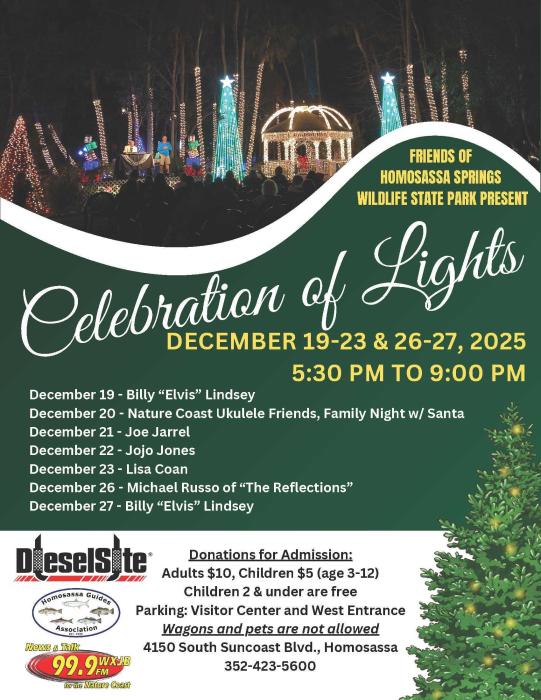 Join us for a magical holiday experience at the Celebration of Lights in Ellie Schiller Homosassa Springs Wildlife State Park! Enjoy a dazzling synchronized light and sound show, nightly entertainment, and festive decorations. A cash donation of $10 for adults and $5 for children ages 3 through 12 is suggested. Children age 2 and younger are admitted free. Create unforgettable family memories and embrace the holiday spirit!