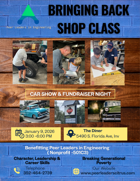 INVERNESS, FL — Peer Leaders in Engineering, a local nonprofit dedicated to youth empowerment, is proud to announce its upcoming "Bringing Back Shop Class" Car Show & Fundraiser Night. The event will take place on January 9, 2025, from 3:00 PM to 6:00 PM at The Diner, located at 5490 S Florida Ave, Inverness.