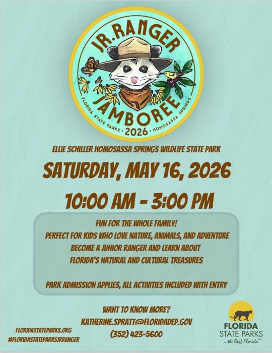 Join us for the Florida State Parks District 2 Junior Ranger Jamboree in celebration of Kids to Parks Day! This event is packed full of exciting activities, interesting programs, park rangers, and more. Young visitors can become Junior Rangers, earning their badge and getting stamps toward getting a Junior Ranger pin. Visit multiple activity stations staffed by rangers from a dozen different Florida State Parks and learn about all the neat natural and cultural resources state parks protect. Activities will be in the park’s Garden of the Springs.