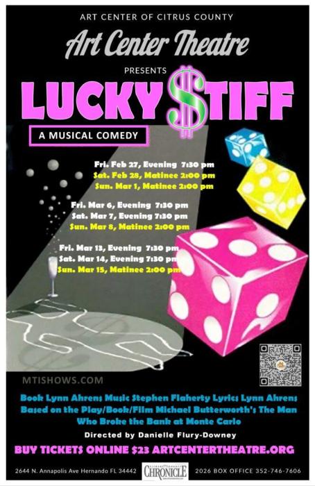 Lucky Stiff is a madcap, hilarious romp of a musical that follows Harry Witherspoon’s journey from England to Monte Carlo...with a rather unusual traveling companion. Based on Michael Butterworth’s novel, The Man Who Broke the Bank at Monte Carlo, Harry receives the unexpected news that he has inherited a fortune from his late Uncle Anthony, on the condition that he takes Anthony’s dead body on a special trip to Monte Carlo. If Harry fails, the money will go to the Universal Dog Home of Brooklyn. However, also hot on the tail of Uncle Anthony’s money is Rita, Anthony’s lover with whom he embezzled $6 million behind her husband’s back. And hot on Rita’s trail is her brother Vinnie, who has been blamed for the crime! With mistaken identities, love interests, disguises, farcical chases, and an omnipresent corpse, Lucky Stiff is an offbeat murder mystery with a difference.