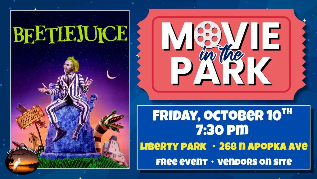 Join us on Friday, October 10th for Movie in the Park at Liberty Park! Featuring a free showing of Beetlejuice (1988) beginning at dusk (approximately 7:30 PM). Bring your blankets, lawn chairs, and picnic baskets for a free fun and family-friendly evening under the stars. Vendors will be available on site. Liberty Park is located at 268 N Apopka Ave, Inverness FL 34450.