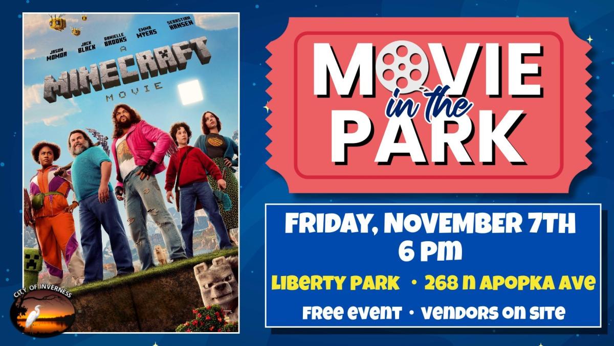 Join us on Friday, November 7th for Movie in the Park at Liberty Park! Featuring a free showing of A Minecraft Movie beginning at dusk (approximately 6 PM). Bring your blankets, lawn chairs, and picnic baskets for a free fun and family-friendly evening under the stars. Vendors will be available on site. Liberty Park is located at 268 N Apopka Ave, Inverness FL 34450.