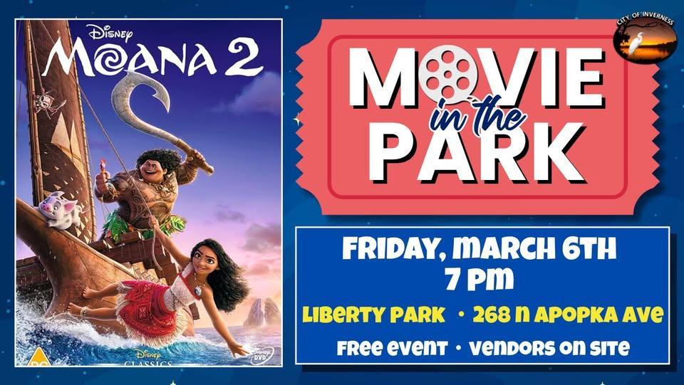 Join us on Friday, March 6th for Movie in the Park at Liberty Park! We’ll be showing Moana 2 beginning at dusk (approximately 6:30 PM). Bring your blankets, lawn chairs, and picnic baskets for a free fun and family-friendly evening under the stars. Food & snack vendors will be on site with items available for purchase. Liberty Park is located at 268 N Apopka Ave, Inverness FL 34450.