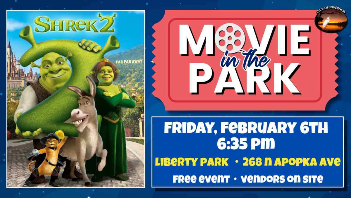 Join us on Friday, February 6th for Movie in the Park at Liberty Park! We’ll be showing Shrek 2 beginning at dusk (approximately 6:35 PM). Bring your blankets, lawn chairs, and picnic baskets for a free fun and family-friendly evening under the stars. Food & snack vendors will be on site with items available for purchase. Liberty Park is located at 268 N Apopka Ave, Inverness FL 34450.